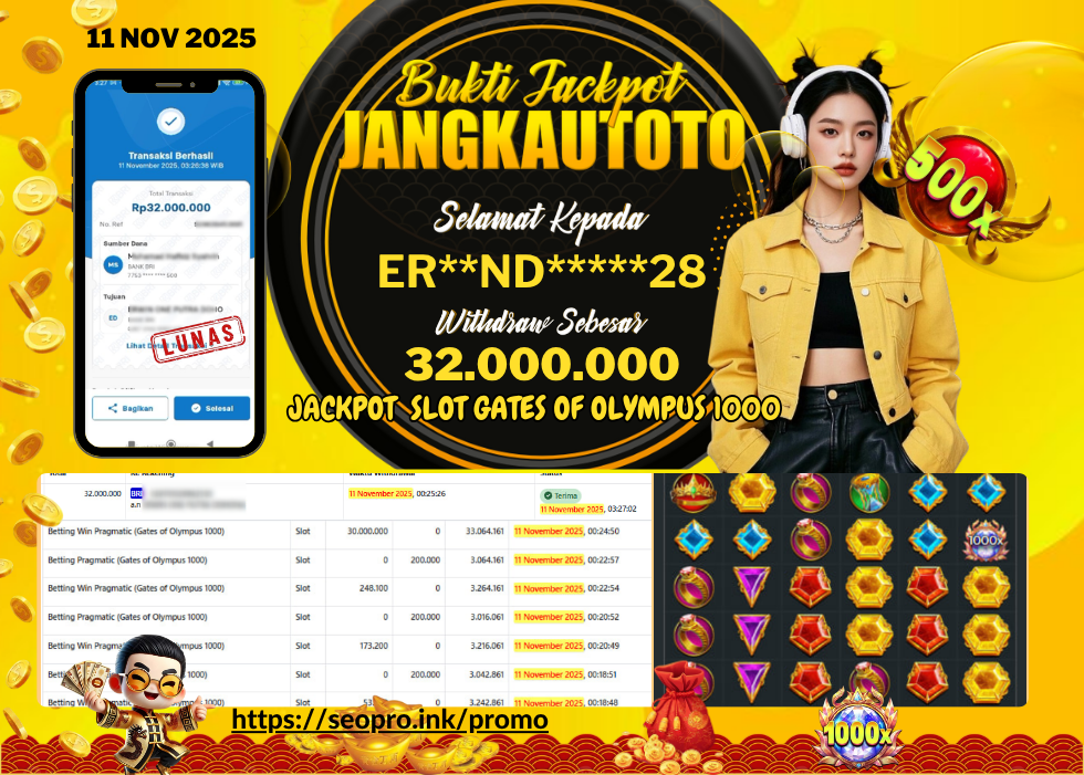 Kami mengucapkan Selamat kepada member setia JANGKAUTOTO Dengan Username Er****oh***28 , Withdraw hasil JACKPOT DI GATES OF OLYMPUS 1000 Sebesar Rp. 32.000.000 ,- Telah LUNAS diproses