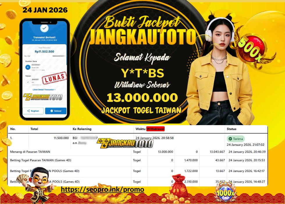 Kami mengucapkan Selamat kepada member setia JANGKAUTOTO Dengan Username Y*T*BS, Withdraw hasil JACKPOT TOG3L T4IWAN 3000 Sebesar Rp.13.000.000,- Telah LUNAS diproses