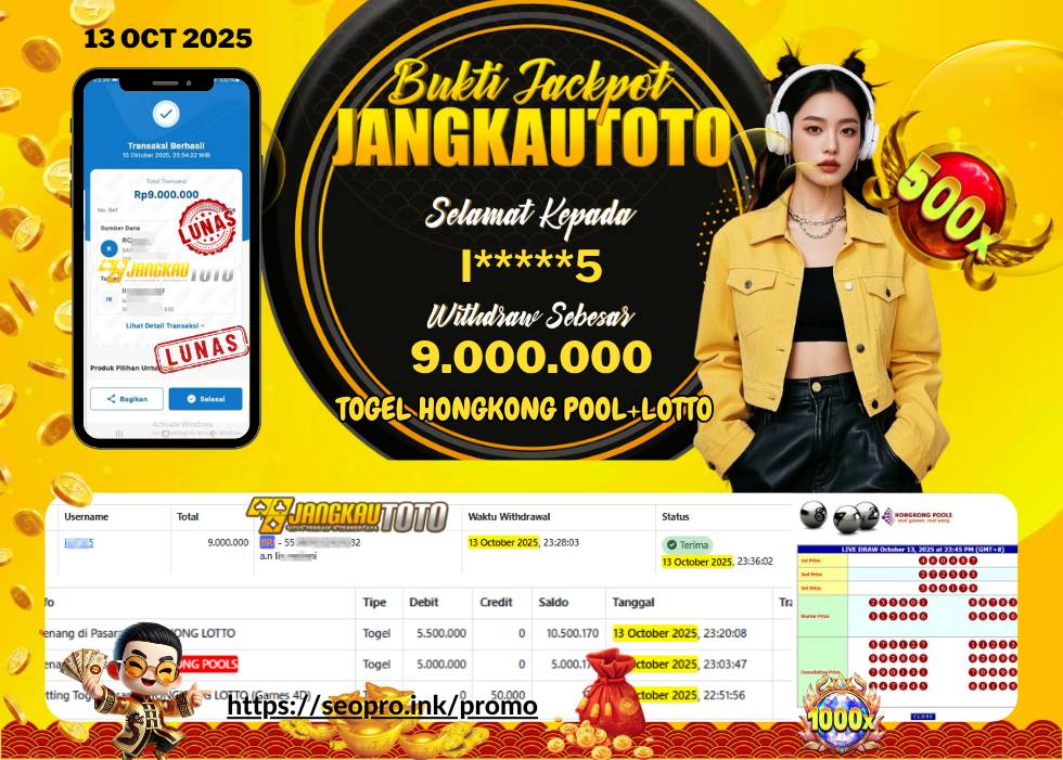 Kami mengucapkan Selamat kepada member setia JANGKAUTOTO Dengan Username I*****5 , Withdraw hasil TOGEL TOGEL HKPOOL+LOTTO Sebesar Rp.9.000.000,- Telah LUNAS diproses