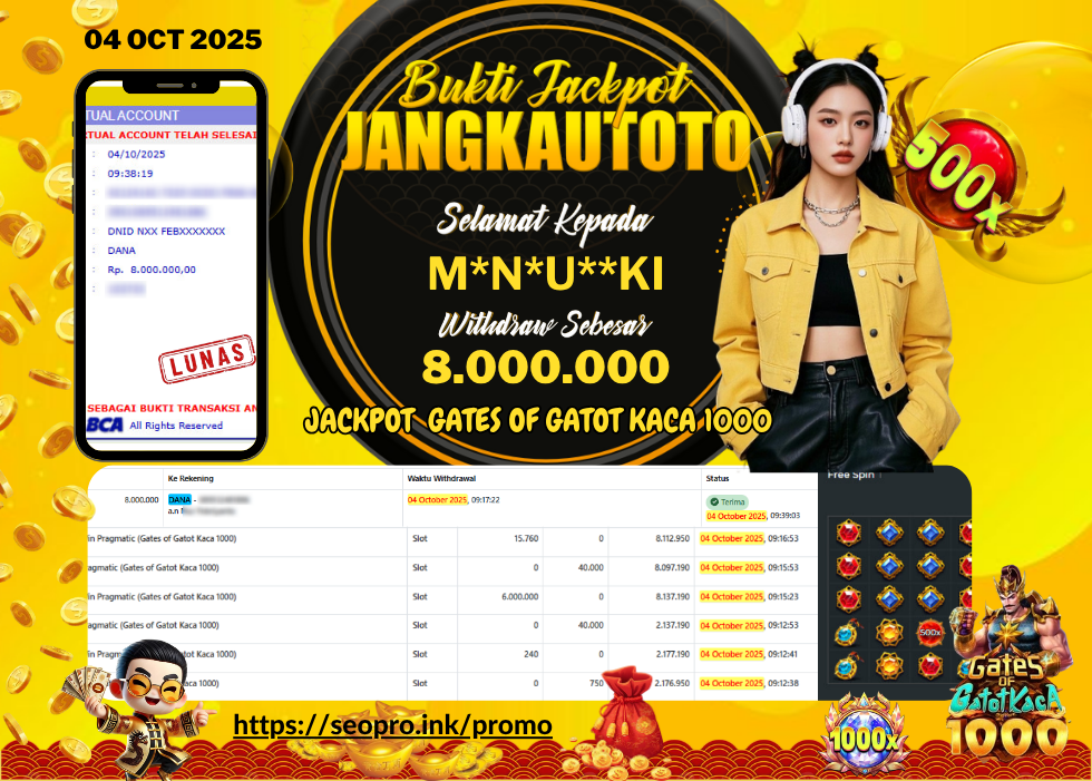 Kami mengucapkan Selamat kepada member setia JANGKAUTOTO Dengan Username M*NT*H*KI , JANGKAUTOTO JACKPOTGates of Gatot Kaca 1000 Rp.8.000.000,- LUNAS Telah diproseskan