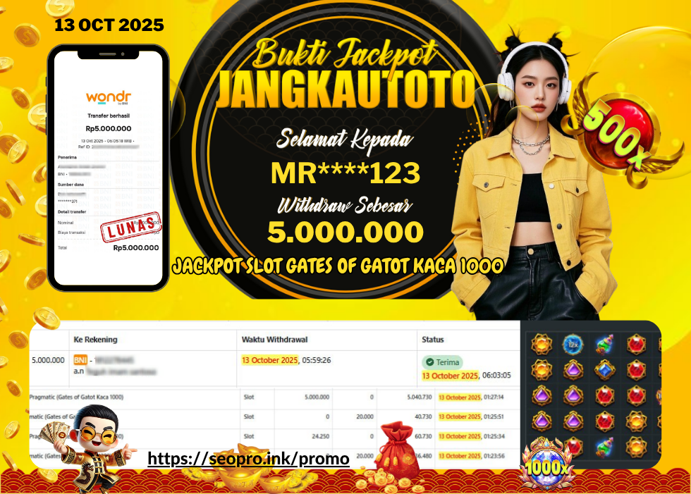 Kami mengucapkan Selamat kepada member setia JANGKAUTOTO Dengan Username MR******1 23, Withdraw hasil JACKPOT Gates of Gatot Kaca 1000 Sebesar Rp.5.000.000,- Telah LUNAS diproses dengan BAIK dan BENAR ke REKENING yang terdaftar DI BO JANGKAUTOTO.