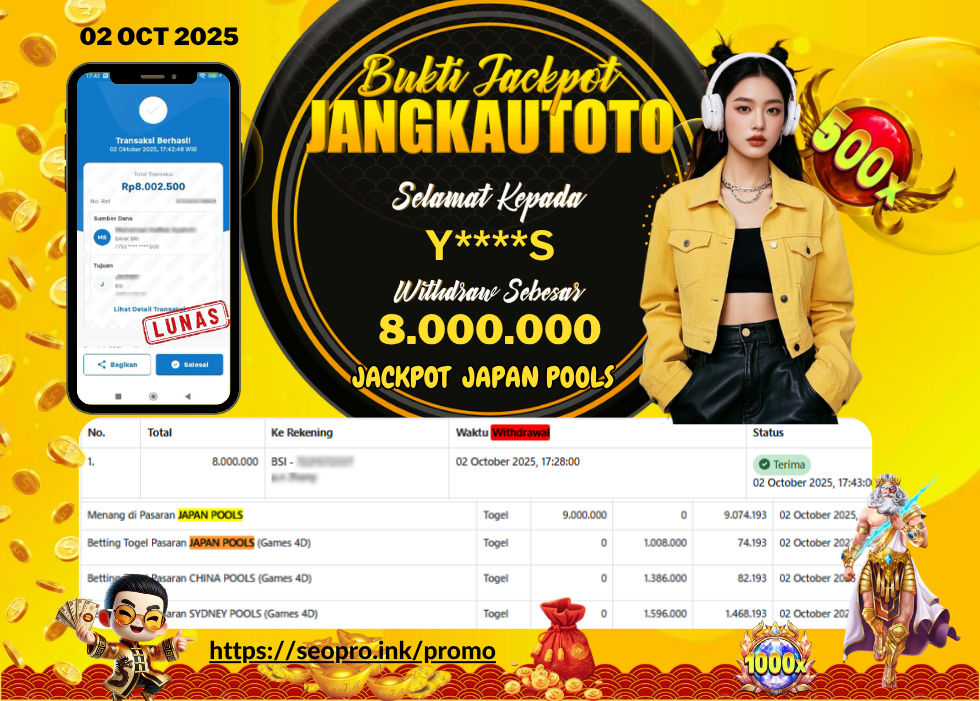 Kami mengucapkan Selamat kepada member setia JANGKAUTOTO Dengan Username Y***S , JANGKAUTOTO JACKPOT JAPAN POOLS Rp.8.000.000,- ,- LUNAS Telah diproseskan