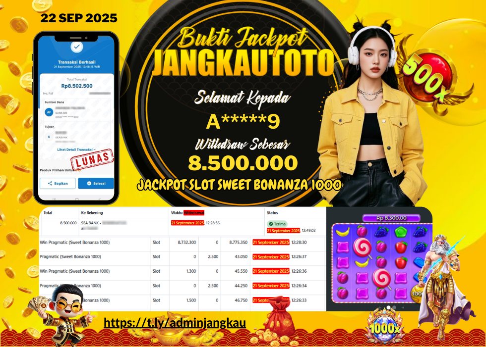 Kami mengucapkan Selamat kepada member setia JANGKAUTOTO Dengan Username A*****9, JANGKAUTOTO JACKPOT SLOT Sweet Bonanza 1000 Rp.8.500.000,- Telah diproseskan