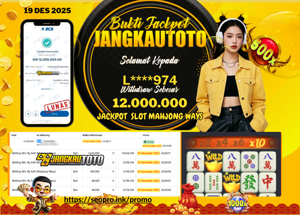 Kami mengucapkan Selamat kepada member setia JANGKAUTOTO Dengan Username L***5974 , Withdraw hasil JACKPOT SLOT MAHJONG WAYS Sebesar Rp. 12.000.000,- Telah LUNAS diproses