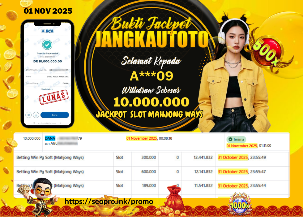Kami mengucapkan Selamat kepada member setia JANGKAUTOTO Dengan Username A***09 , Withdraw hasil JACKPOT DI SLOT MAHJONG WAYS Sebesar Rp. 10.000.000,- Telah LUNAS diproses