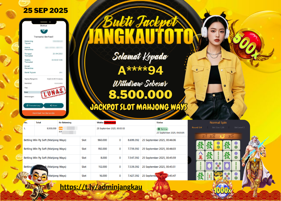 Kami mengucapkan Selamat kepada member setia JANGKAUTOTO Dengan Username A****94, JANGKAUTOTO JACKPOT SLOT Soft Mahjong Ways Rp.8.500.000,- Telah diproseskan