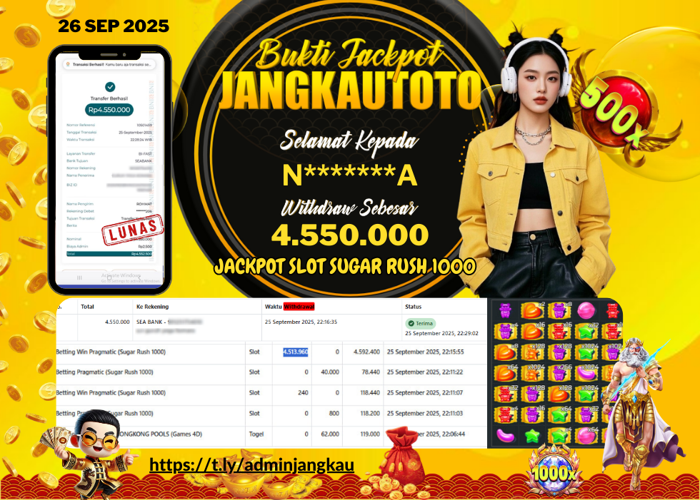 Kami mengucapkan Selamat kepada member setia JANGKAUTOTO Dengan Username N*******4, JANGKAUTOTO JACKPOT SLOT Sugar Rush 1000 Rp.4.550.000,-Telah diproseskan