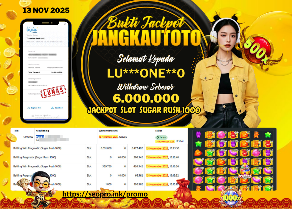 Kami mengucapkan Selamat kepada member setia JANGKAUTOTO Dengan Username L***YON***0 , Withdraw hasil JACKPOT DI SUGAR RUSH 1000 Sebesar Rp. 6.000.000 ,- Telah LUNAS diproses