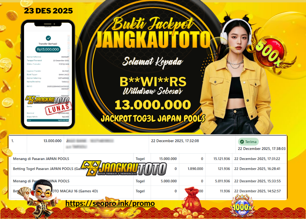 Kami mengucapkan Selamat kepada member setia JANGKAUTOTO Dengan Username B**WI**RS , Withdraw hasil JACKPOT T0G3L JAPAN POOLS Sebesar Rp. 13.000.000,- Telah LUNAS diproses