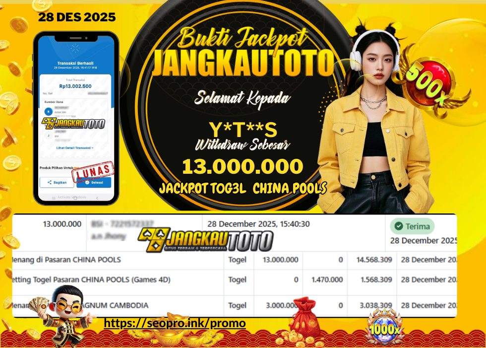 Kami mengucapkan Selamat kepada member setia JANGKAUTOTO Dengan Username Y*t**s , Withdraw hasil JACKPOT T0G3L CHINA POOLS Sebesar Rp. 13.000.000,- Telah LUNAS diproses