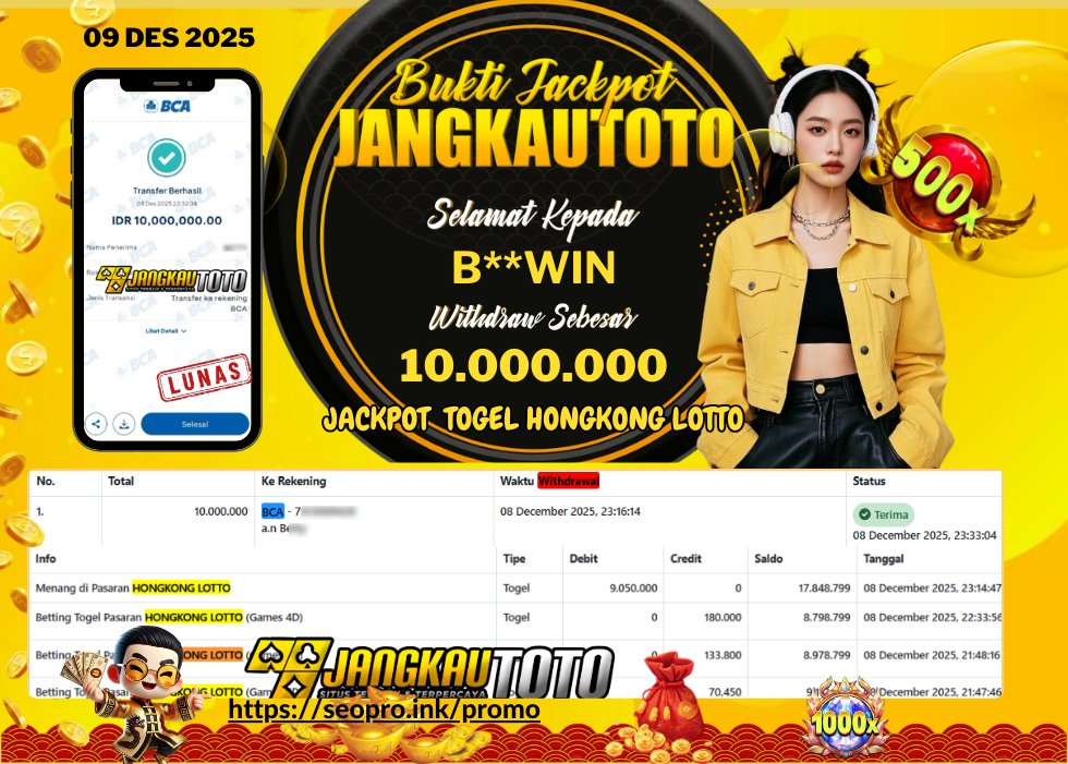 Kami mengucapkan Selamat kepada member setia JANGKAUTOTO Dengan Username B*T*IN , Withdraw hasil JACKPOT T0G3L HONGKONG LOTTO Sebesar Rp. 10.000.000,- Telah LUNAS diproses