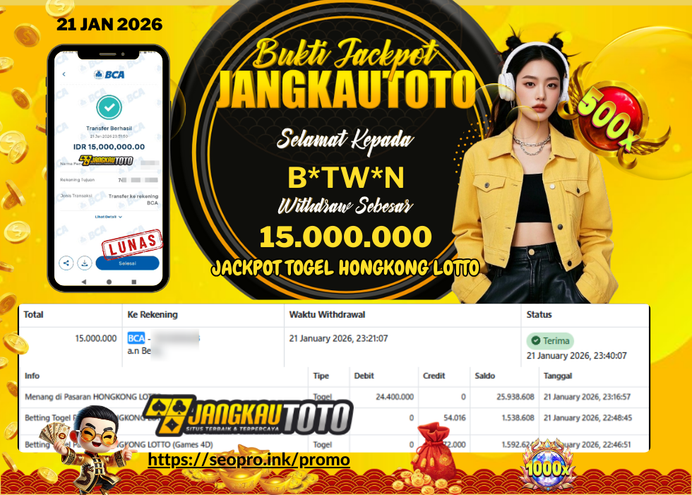 Kami mengucapkan Selamat kepada member setia JANGKAUTOTO Dengan Username B*TW*N , Withdraw hasil JACKPOT T0G3L HONGKONG LOTTO Sebesar Rp. 15.000.000,- Telah LUNAS diproses