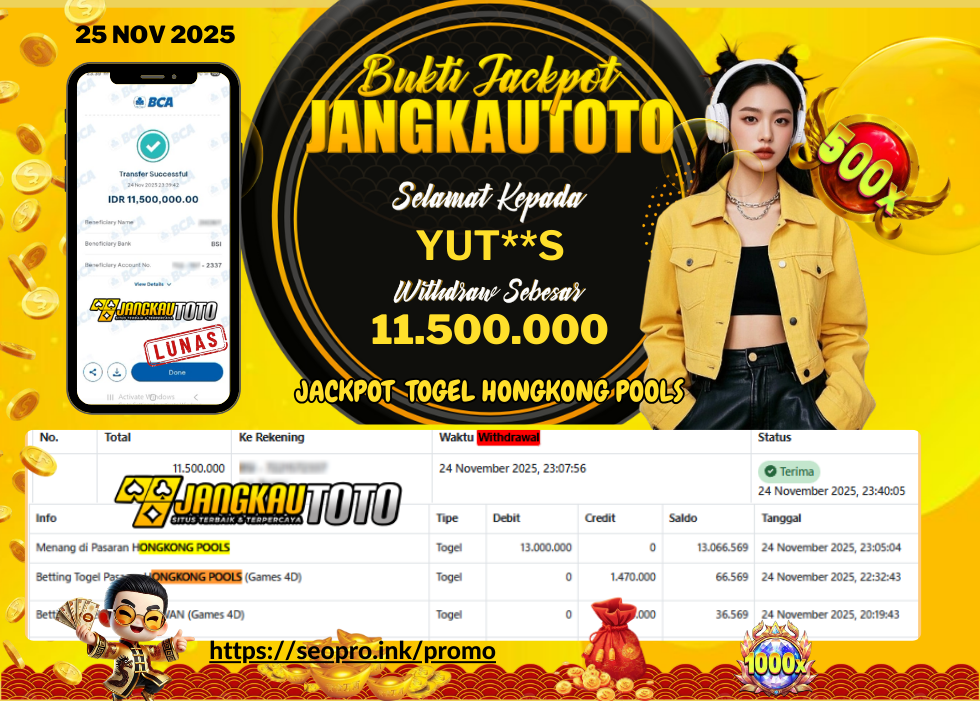 Kami mengucapkan Selamat kepada member setia JANGKAUTOTO Dengan Username YUT**S, Withdraw hasil JACKPOT T0G3L HONGKONG POOLS Sebesar Rp.11.500.000,- Telah LUNAS diproses