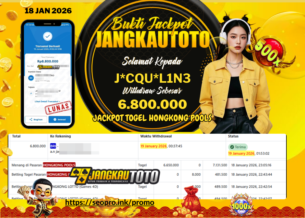 Kami mengucapkan Selamat kepada member setia JANGKAUTOTO Dengan Username j4cqu3l1n3 , Withdraw hasil JACKPOT T0G3L HONGKONG POOLS Sebesar Rp. 6.800.000,- Telah LUNAS diproses