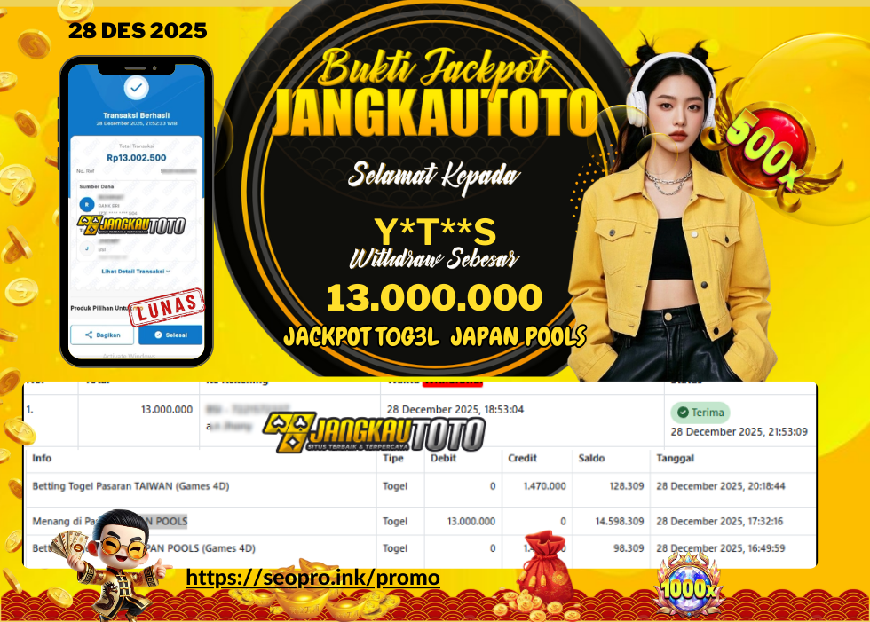 Kami mengucapkan Selamat kepada member setia JANGKAUTOTO Dengan Username Y*t**s , Withdraw hasil JACKPOT T0G3L JAPAN POOLS Sebesar Rp. 13.000.000,- Telah LUNAS diproses