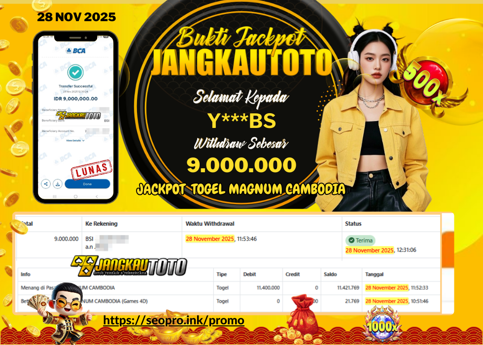 Kami mengucapkan Selamat kepada member setia JANGKAUTOTO Dengan Username YU***S , Withdraw hasil JACKPOT T0G3L MAGNUM CAMBODIA Sebesar Rp. 9.000.000,- Telah LUNAS diproses