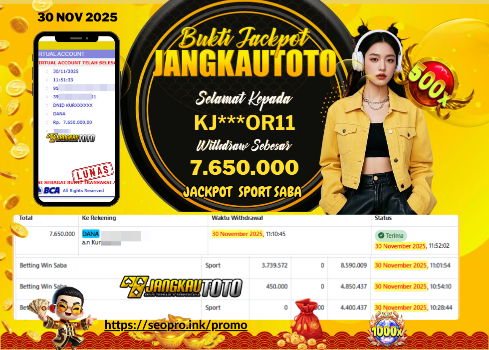 Kami mengucapkan Selamat kepada member setia JANGKAUTOTO Dengan Username Kju***r11 , Withdraw hasil JACKPOT SPORT SABA Sebesar Rp. 7.650.000,- Telah LUNAS diproses