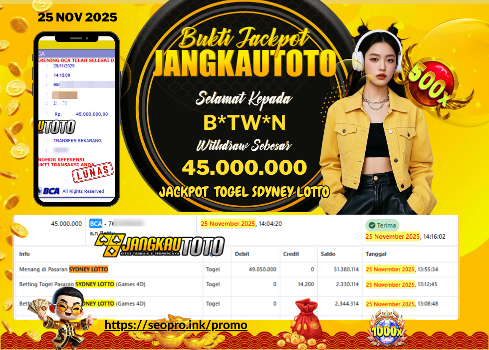 Kami mengucapkan Selamat kepada member setia JANGKAUTOTO Dengan Username B***IN , Withdraw hasil JACKPOT T0G3L SDYNEY LOTTO Sebesar Rp. 45.000.000,- Telah LUNAS diproses