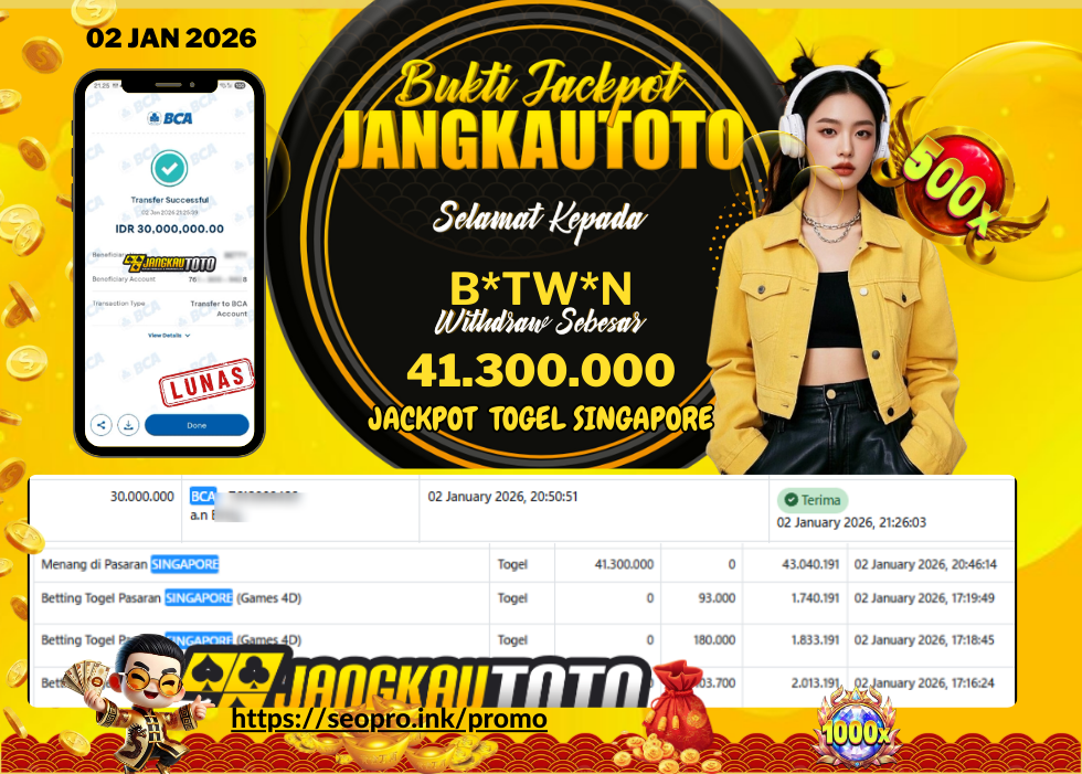 Kami mengucapkan Selamat kepada member setia JANGKAUTOTO Dengan Username B*TW*N , Withdraw hasil JACKPOT T0G3L SINGAPORE Sebesar Rp. 41.300.000,- Telah LUNAS diproses