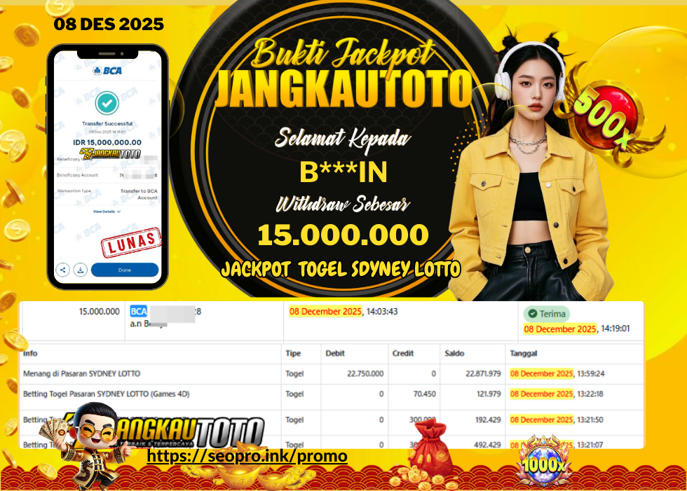 Kami mengucapkan Selamat kepada member setia JANGKAUTOTO Dengan Username B***IN , Withdraw hasil JACKPOT T0G3L SDYNEY LOTTO Sebesar Rp. 15.000.000,- Telah LUNAS diproses