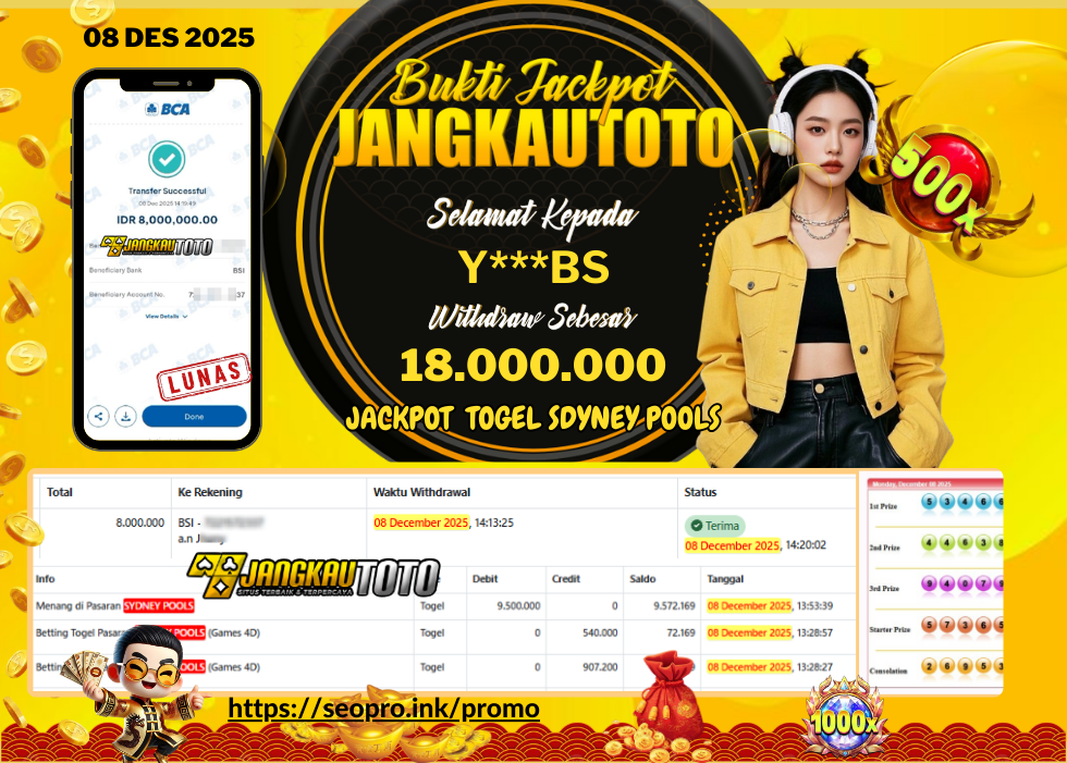 Kami mengucapkan Selamat kepada member setia JANGKAUTOTO Dengan Username Y*T*BS , Withdraw hasil JACKPOT T0G3L SDYNEY POOLS Sebesar Rp. 18.000.000,- Telah LUNAS diproses