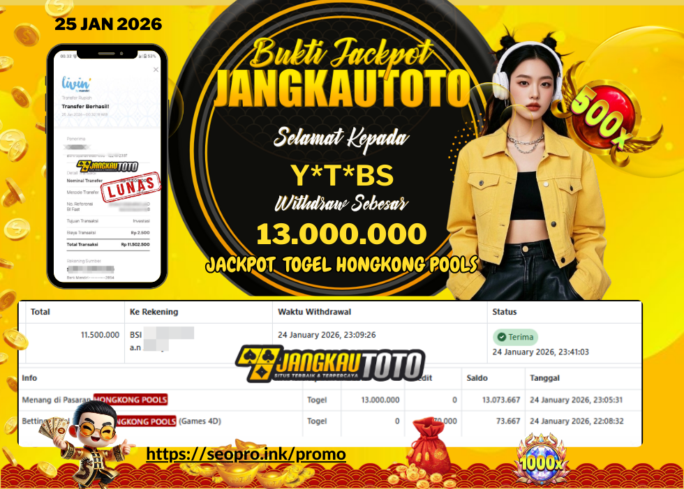 Kami mengucapkan Selamat kepada member setia JANGKAUTOTO Dengan Username Y*T*BS, Withdraw hasil JACKPOT TOG3L HONGKONG POOLS Sebesar Rp.13.000.000,- Telah LUNAS diproses