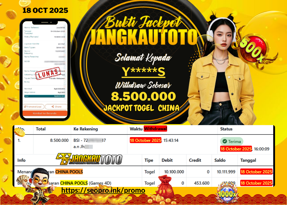 Kami mengucapkan Selamat kepada member setia JANGKAUTOTO Dengan Username Y***S , Withdraw hasil JACKPOT DI TOGEL CHINA POOLS Sebesar Rp.8.500.000,- Telah LUNAS diproses