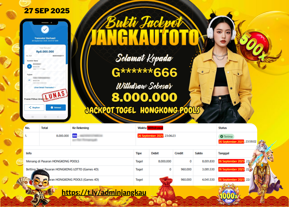 Kami mengucapkan Selamat kepada member setia JANGKAUTOTO Dengan Username G******666, JANGKAUTOTO JACKPOT TOGEL HONGKONG POOLS Rp.8.000.000,-Telah diproseskan