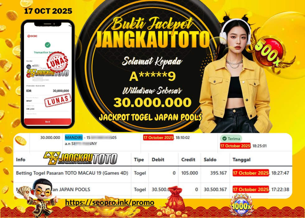 Kami mengucapkan Selamat kepada member setia JANGKAUTOTO Dengan Username A******9 , Withdraw hasil TOGEL TOGEL JAPAN POOLS Sebesar Rp.30.000.000,- Telah LUNAS diproses