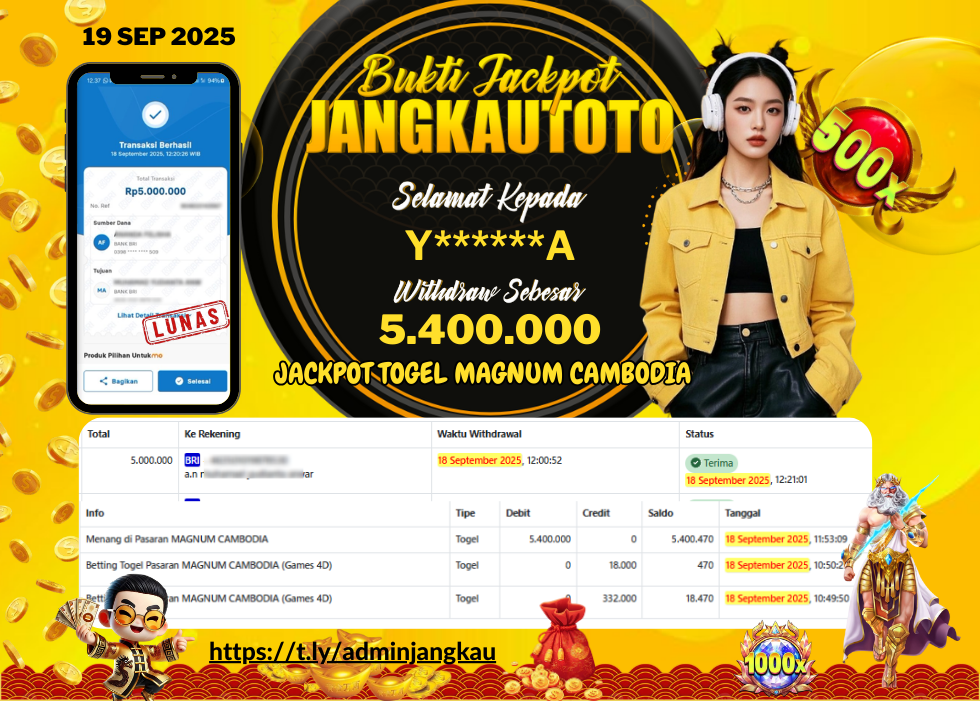 Kami mengucapkan Selamat kepada member setia JANGKAUTOTO Dengan Username Y*****A , JANGKAUTOTO JACKPOT TOGEL Magnum Cambodia Rp.5.400.000 Telah diproseskan